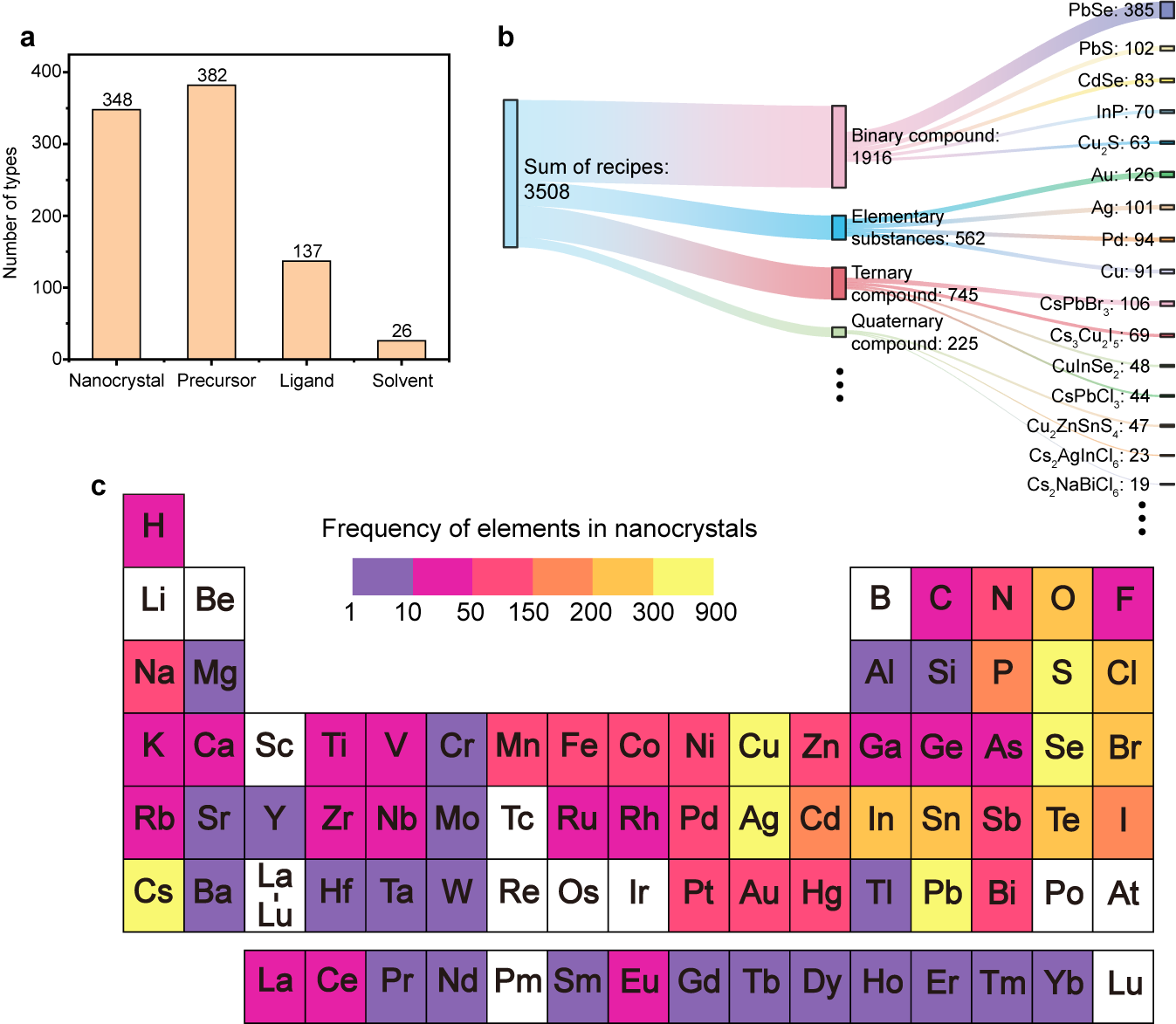 图1. (a)所有配方中包含的不同类型化学物质数量,按量子点、前驱体、配体和溶剂分类;(b)各类量子点合成配方分布示意图,按元素物质、二元化合物、三元化合物和四元化合物分类;(c)配方数据集中不同量子点的元素频率分布