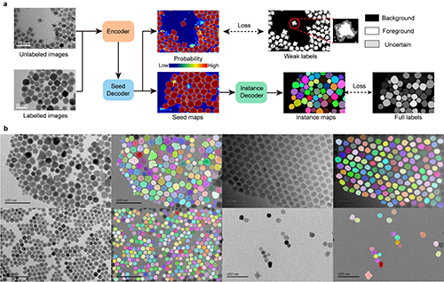 图2. (a)量子点分割模型的半监督学习策略示意图;(b)TEM图像的分割效果图