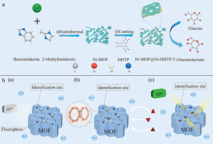 图2 a| Ni-MOF@Ni-HHTP-5杂化NSs的合成示意图及其在葡萄糖检测中的应用。b|说明基于MOF平台的荧光“开启”传感机制。(a)淬灭荧光团的初始状态(OFF)。(b) MOF孔内目标分析物的特定捕获。(c)分析物结合抑制能量转移,导致荧光恢复和放大信号输出(ON)。