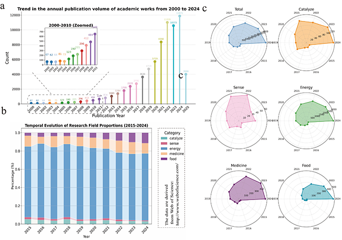 图2. 随着时间的推移,MOF应用增多。a|近25年以“MOF”为关键词索引的出版物发展情况。b|2015-2024年研究领域比例的变化趋势。该图展示了催化、传感、能源、医学和食品领域的相对研究比例,反映了科学研究的重点领域随时间的变化。
