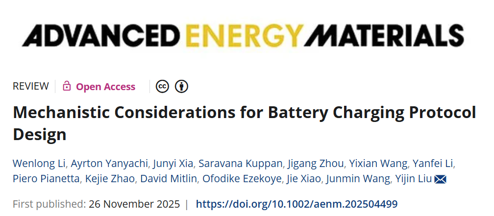 Li, W.; Yanyachi, A.; Xia, J.; Kuppan, S.; Zhou, J.; Wang, Y.; Li, Y.; Pianetta, P.; Zhao, K.; Mitlin, D.; Ezekoye, O.; Xiao, J.; Wang, J.; Liu, Y., Mechanistic Considerations for Battery Charging Protocol Design. Adv. Energy Mater. 2025.