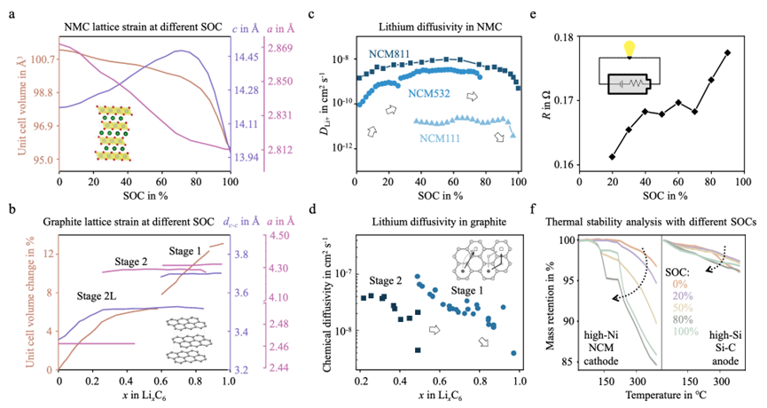 a) Changes in the unit cell volume, the c and a lattice parameters of NMC811 at various SOCs during the first charge. b) Changes in the unit cell volume, the interlayer spacing dc-c and the a-axis of graphite versus the lithium content. c) Variation of the lithium diffusion coefficient, , of NMC811, NMC532, and NMC111 as a function of the SOC. d) The lithium diffusivity for the Stage 2 (dark blue squares) and Stage 1 (light blue circles) phases in the Li-graphite system, derived from kinetic Monte Carlo simulations. e) Battery internal Ohmic resistance at various SOC. f) Thermal stabilities of Ni-rich NMC cathode and Si-rich Si-C anode at different SOCs.