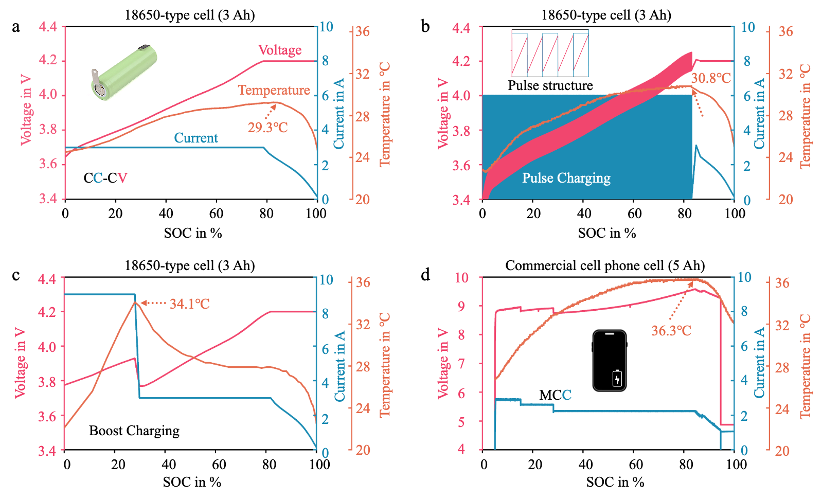 Illustrative measurements of battery temperature evolution under different charging protocols. a) 1C CC–CV for a newly purchased commercial 18650-type NMC–graphite lithium-ion cell (nominal capacity 3.0 Ah, nominal voltage 3.6 V, unused), b) 1C pulse charging (2C current, alternating 1 s charging with 1 s rest) followed by CV for the same type of cell, c) 1C boost charging with CV for the same type of cell, and d) a commercial Xiaomi Redmi Note 12 smartphone (built-in 5.0 Ah cell) charged with a 33 W charger. Temperature was monitored at the cell surface using a thermocouple.