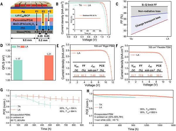综上,本研究开发了一种可在环境条件下对钙钛矿薄膜进行高质量后处理的激光退火(LA)技术。该技术能够实现快速能量输入,显著提升钙钛矿器件的性能与稳定性。研究人员随后在带隙分别为1.57 eV(效率26.2% vs. 对照组24.0%)和1.67 eV(22.6% vs. 20.4%)的钙钛矿器件上验证了该技术的有效性。对于100 cm2的刚性和柔性钙钛矿太阳能组件(PSMs),认证光电转换效率(PCE)分别达到24.0%和20.7%,相较于同尺寸对照器件,认证效率分别提升了3.0%和5.0%。本研究建立了一种适用于大面积光伏器件的高通量、可扩展的后处理策略,为高性能PSCs和PSMs的产业化提供了具有商业可行性的路径。通过实现在环境条件下的高效制造,LA工艺代表了推动钙钛矿太阳能技术大规模应用的一项变革性进展。