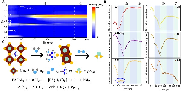 基于以上难题,广安理工学院(筹)Hongxiang Li联合南昌大学陈义旺教授、胡笑添教授在Science上发表了题为“Laser annealing enables rapid, degradation-free ambient processing of perovskite solar modules”的论文,报道一种纳秒激光退火(LA)技术,可在环境条件下实现钙钛矿薄膜的快速后处理。通过GIWAXS分析,研究人员揭示了热处理过程中存在的四阶段降解机制,并确定了一个时长为123 ± 18秒的“无环境降解窗口”,在此期间水和氧气的影响被有效抑制。采用LA(波长455纳米,辐照强度20瓦/平方厘米)所提供的辐照度比传统热退火方法(0.06瓦/平方厘米)高出两个数量级,从而有效抑制了6H相钙钛矿的累积。最终,该方法在100 cm2刚性和柔性组件上分别实现24.0%和20.7%的认证效率,VOC与FF乘积达S-Q极限的89%,为钙钛矿光伏的规模化、高速、低成本制造提供了突破性解决方案。南昌大学为本文第一通讯单位。