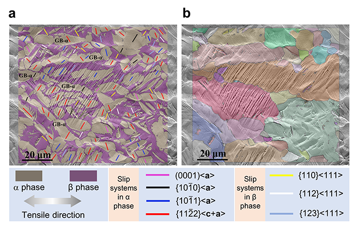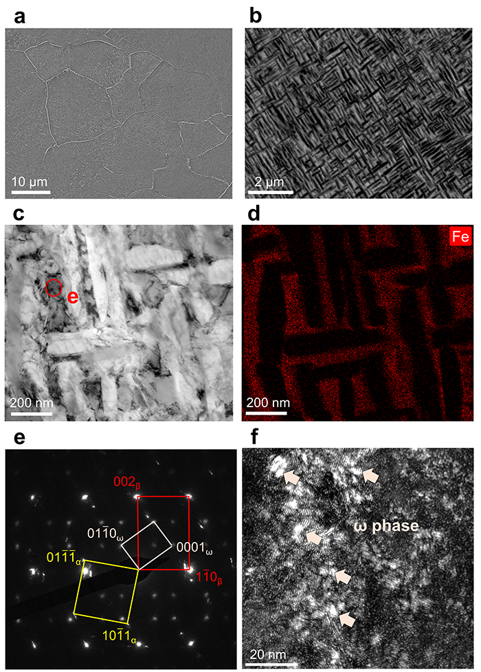 构建α-β片层结构促进滑移传递:通过添加廉价β稳定元素铁(Fe),并结合激光粉末床打印技术与后续热处理,构建出具有连贯界面的α-β层片结构,实现滑移跨相界持续传递,进一步提升均匀塑性。