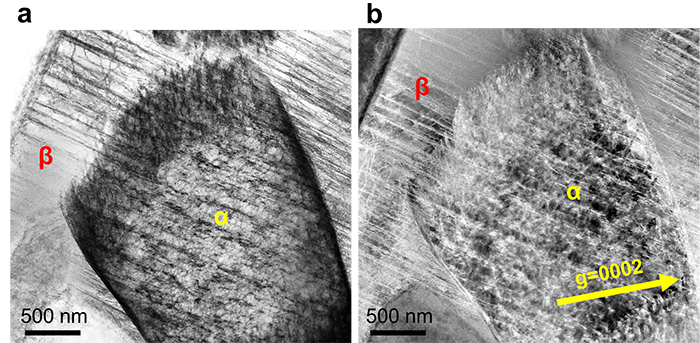 图5. α-β Ti-0.45O-4Fe合金(PBF-LB + 800 °C退火1小时)在拉伸变形过程中的位错活动。