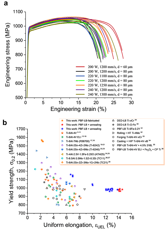 图7. Ti-0.5O-5Fe合金(PBF-LB + 800 °C退火1小时)的工程应力-应变曲线。