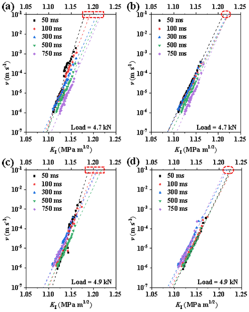 相比之下,压缩双裂纹圆孔板法(DCDC)通过在干燥惰性气氛下获取区域III的裂纹扩展速度-应力强度因子(v–KI)曲线,并采用反应动力学指数模型求解KIc(图1),具备清晰的物理内涵。Wiederhorn基于阿伦尼乌斯反应动力学方程推导出:硅酸盐玻璃在区域III中遵循指数关系v = A exp(B·KI);且通过大量实验总结出硅酸盐玻璃KIc对应的裂纹扩展速率约为10–1 m/s。因此,只要能够准确获得区域III的本征v–KI曲线,即可通过指数拟合得到准确的KIc数值。然而,实际DCDC测试中存在下述异常现象(图2):高速相机帧间隔变化时,在v–KI曲线上观测到了明显的不同程度的斜率改变现象。这一异常直接削弱了指数模型的拟合效果,从而影响KIc的准确性和可重复性。