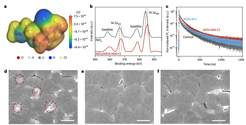 如图2所示,静电势(ESP)图显示MEM-MIM-Cl在乙二醇醚处有明显的负电位,表明它与未配位阳离子如NiOx内的Ni(III)或钙钛矿内的Pb(II)存在潜在的强相互作用。与NiOx的相互作用用X射线光电子能谱(XPS)阐明,正如预期的那样,在MEM-MIM-Cl-改性的NiOx膜中对应于Ni 2p1/2和2p3/2的峰与原始NiOx中的那些峰相比显示出向较低结合能的偏移。通过剥离钙钛矿薄膜观察其底部界面形貌发现,对照样品中存在明显的PbI2团簇,而MEM-MIM-Cl则完全消除了这些有害聚集,促进了更大晶粒的生长,获得了更均匀、缺陷更少的埋底界面。