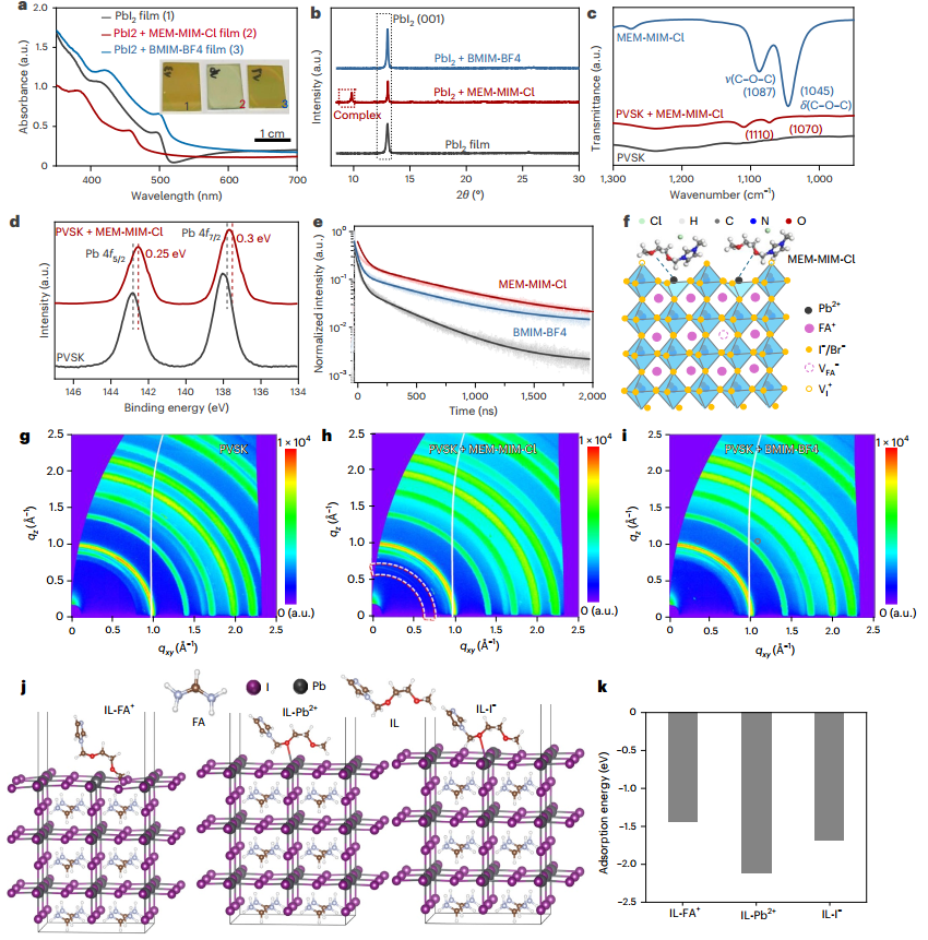 如图3所示,将MEM-MIM-Cl添加到PbI2膜中导致从黄色到较浅颜色的明显变化,具有蓝移的吸收光谱,这表明形成了络合物。这种潜在的络合作用进一步得到了MEM-MIM-Cl-改性的PbI2膜中出现的新XRD峰的支持。重要的是,离子液体不影响光吸收或最高占据分子轨道能级,而MEM-MIM-Cl改性的钙钛矿薄膜具有更强和更尖锐的衍射峰,表明钙钛矿结晶度得到了改善。通过傅里叶变换红外光谱(FTIR)和XPS分析,进一步揭示了上述中间相的化学性质,前者主要是来自IL的潜在配位,后者主要是Pb(II)。MEM-MIM-Cl中乙二醇醚侧链的C-O-C伸缩和弯曲振动峰在与钙钛矿混合后发生位移,证实了醚链与PbI2之间的配位作用是离子液体与钙钛矿相互作用的核心机制。密度泛函理论计算表明,乙二醇醚基团对Pb²⁺具有最强的吸附能,这使其能优先与配位不足的Pb(II)结合,从而有效钝化碘空位缺陷。