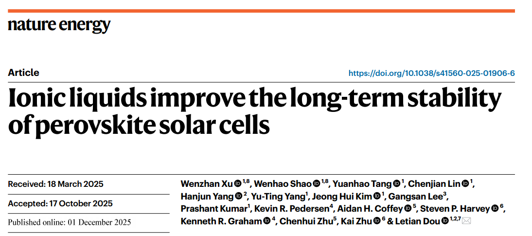 文献链接:Ionic liquids improve the long-term stability of perovskite solar cell,2025,https://doi.org/10.1038/s41560-025-01906-6)