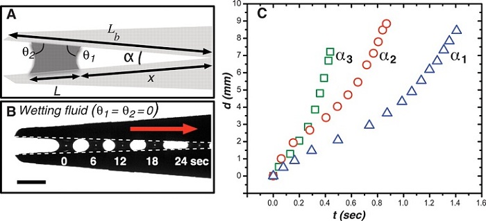 2008年science文章《水鸟啄食的表面张力运输:毛细棘轮效应》的作者,就建立了一个模型,将完全润湿的橄榄油液滴置于楔形槽开口处,从而发现几个如下的“真理”: