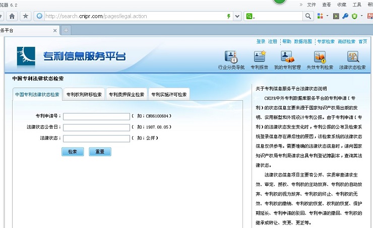 检索网站 中国知识产权网:http://search.cnipr.com/pages!legal.action