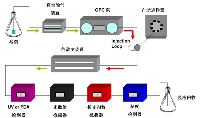 Gel Permeation Chromatography (GPC),也称作Size Exclusion Chromatography (SEC) 或者Gel Filtration Chromatography (GFC),是一种根据尺寸分离高分子材料的色谱技术。GPC柱子分离原理是基于分子大小而不是分子量(Mw),当样品从色谱柱中洗脱出来,使用一个或多个检测器对其进行检测,通过传统校正曲线,通用校正曲线或者多检测器联用计算得到不同的物理参数的分布,比如分子量,分子尺寸(包括回旋半径(Rg)和流体力学体积半径(Rh)),粘度特性,同时还有高分子结构,构象,缔合,共聚组成等信息。