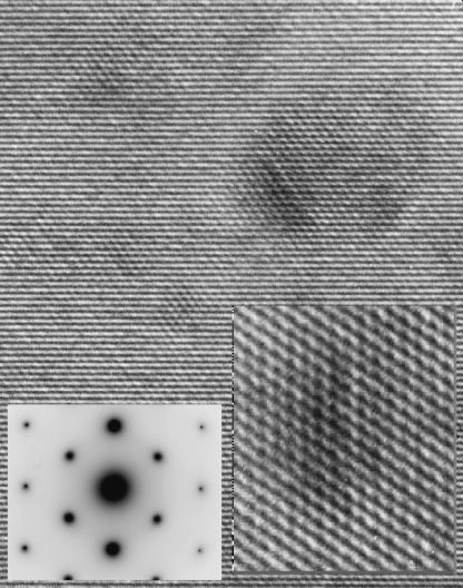 高分辨电子显微像是让物镜后焦面的投射束河若干衍射通过物镜光阑,由于他们的相位相干而形成的相位衬度显微图像。由于参加成像的衍射束数量不同,得到不同名称的高分辨像。如图九中,固溶态Al-Si合金的二维晶格像,就是利用透射束加二维方向衍射束显示出来的。