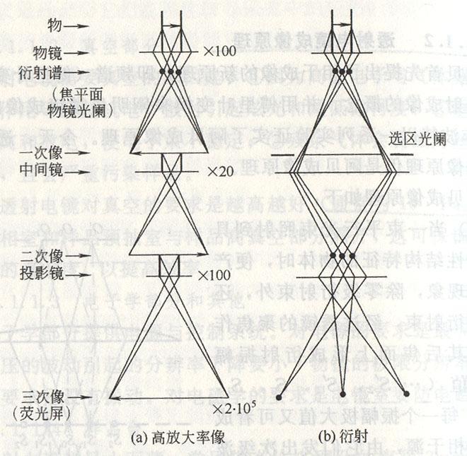 图二 TEM中成像(a)和成衍射谱(b)的光路图