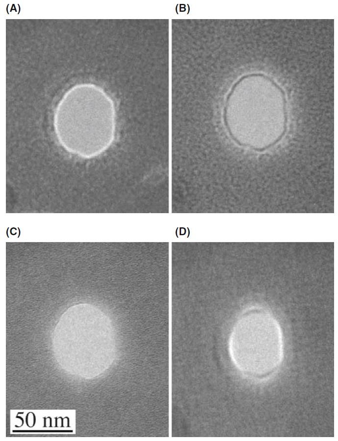 图七 非晶碳膜孔洞在(A)欠焦(B)过焦(C)正焦(D)有物镜像散的低倍透射照片