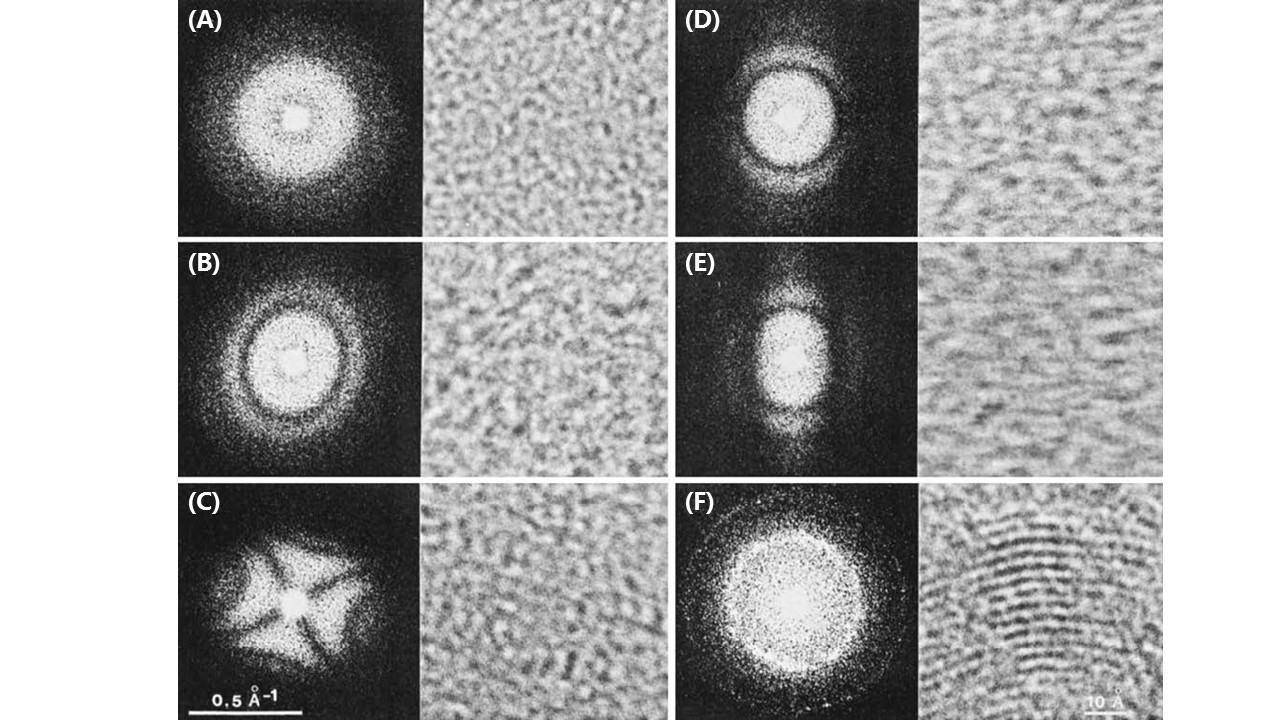 图八 碳膜非晶区在(A)无像散无漂移(B)有像散(C)严重像散(D)无像散有一点漂移(E)无像散有更大的漂移(F)无像散无漂移情况下的高分辨照片和对应的FFT花样
