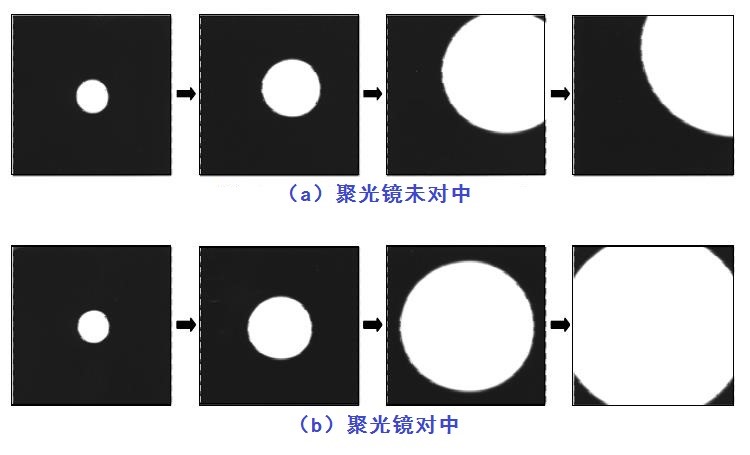 图四 (a)聚光镜光阑未对中的情况和(b)聚光镜光阑对中完成的情况