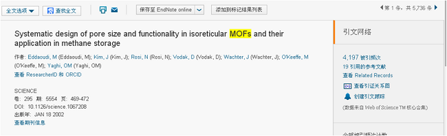 在检索栏中输入关键字,如输入MOFs,找到最高引文文献,然后按照下面的方式设置: