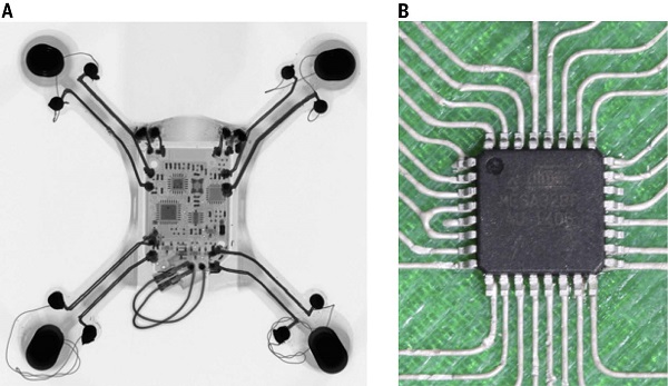 图4 Voxel8制作的3D打印结构:(A)四轴无人飞机的X-射线图;(B)打印的电路结构