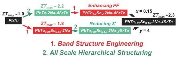通过结合能带结构工程与全尺度的多级层次结构化,获得高性能PbTe0.85Se0.15-2%Na-4%SrTe样品的可选路线。