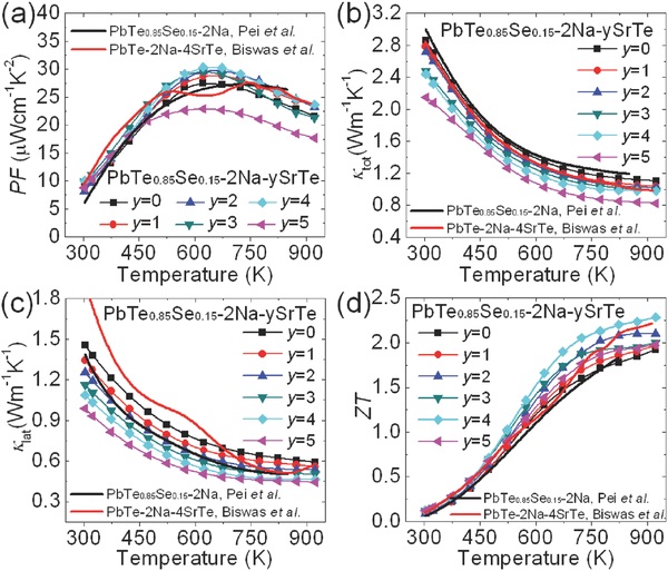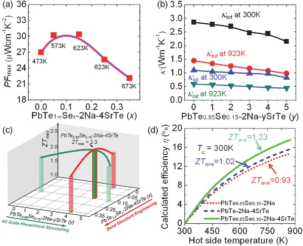 北京航空航天大学的赵立东教授和美国西北大学的Mercouri G. Kanatzidis(共同通讯作者)等人构建PbTe1−xSex-2%Na-y%SrTe体系,并证实PbTe0.85Se0.15-2%Na-4%SrTe在923K时具最大ZT值2.3。这主要通过修正电子能带结构,构建全尺度的多级层状结构并将这两种效应结合起来实现。同时PbTe0.85Se0.15-2%Na-4%SrTe在300-873K的温度之间,平均ZT值还能达到1.23,这很大程度上超过了很多类型的热电材料。PbTe1−xSex-2%Na-y%SrTe的制备可选择PbTe-2Na-4SrTe或是PbTe0.85Se0.15-2Na作为基底实现高性能。室温下,随着SrTe含量的增加,载流子迁移率改变的不明显,但加入5.0%的SrTe时,晶格热导率却会显著的从1.1降低至大约0.82W m-1 K-1,在923K下晶格热导率则会从0.59降低至0.43 W m-1 K-1。由于晶带结构改变,提高Se组分,PbTe1−xSex-2%Na-y%SrTe体系也会达到最大功率系数。