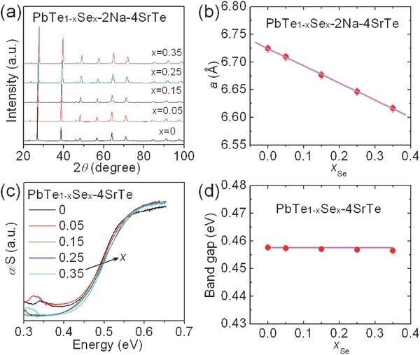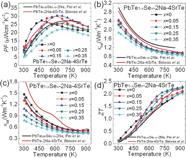 (a) PbTe1-xSex-2Na-4SrTe中,最大功率系数(PFmax)随Se组分含量的改变,表明随着Se组分的增加,PFmax向高温转移。