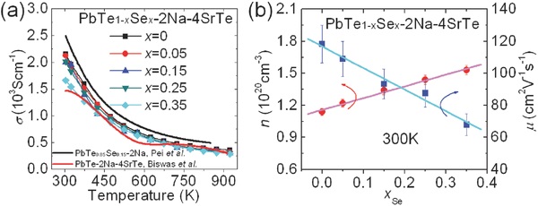 (a) 电导率随温度的改变 (b) 室温下,载流子浓度随Se含量的改变