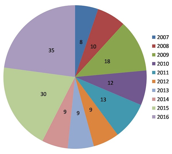 从饼状图中发现,2015年之前,发文数量相差不大。其中,2016年发表影响因子10以上期刊论文20篇,且近两年来,文章的发表数呈高速增长趋势,而这两年正是曾教授进入南京理工大学任教后,纳米光电材料研究所高速发展的阶段。这说明,南京理工大学纳米光电材料研究所在曾教授的指导下,其优越的研究环境吸引了大量人才的加盟,使得研究所得到了长足的发展,科研成果持续增长。据悉,该研究所2016年10月份被直接认定为新型显示材料与器件工信部重点实验室,既是对他们前期工作的认可,预期也将会进一步推动他们高水平原创产出。