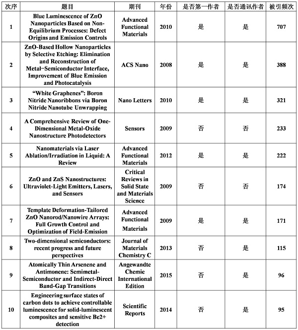 由于篇幅所限,小编列出了ESI高被引文章的前十位,从表中可以看出,被引频次最多的文章为707次,这些高被引文章均发表于Angewandte Chemie International Edition、ACS Nano、Nano Letters、Advanced Functional Materials等国际著名期刊中,其发表时间大部分在2010年前后,在此期间发表的文章质量极为突出,对应他在中科院与国外接受科研训练的时期。2013年以后,进入高被引行列的文章呈现迅猛增长的势态,正好对应他带领南理工纳米光电所与新型显示工信部重点实验室独立从事科研的黄金时期。