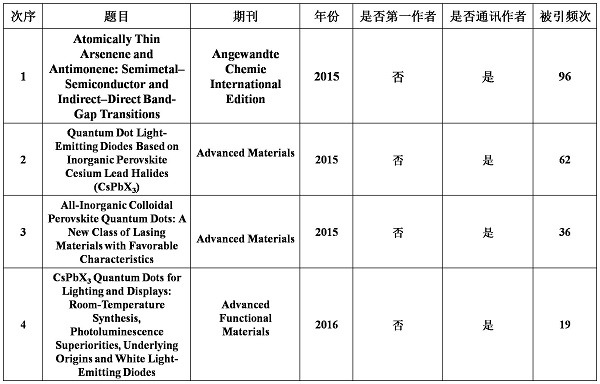 上表列出了ESI热点论文,值得注意的是,论文均为近两年发表,其中发表在德国应化(Angew 2015, 54, 3112)上的这篇文章在国际上率先理论提出了锑烯砷烯及其衍生二维发光材料概念,获得了Nature等学术媒体的高度评价,称其“具有蓝光器件应用前景”;发表在先进材料(Adv. Mater. 2015, 27, 7162)上的这篇文章首创了全无机钙钛矿红绿蓝三基色发光二极管,被Nature Nanotechnology评论为“首次(first)”、“开启了(opened)无机钙钛矿LED”,获江苏省颗粒学会创新奖特等奖(2016)。