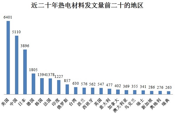 从近20年来全球每年热电材料相关的发文量可以看出,总体呈递增趋势,说明这个领域越来越受到关注,而在近几年,递增趋势尤为明显。可进一步推知,热电材料也将逐渐步入热点研究范围之列,而主要的研究方向着眼于提高材料的ZT值,提高热电特性,并降低材料的制备成本,以推进大规模市场应用进程。