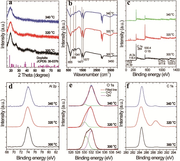 (c)为XPS全谱 (d-f)分别为Al 2p,O 1s,C 1s的高分辨XPS图谱