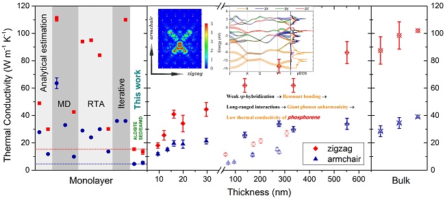 (e)本工作中得到的结果和此前报道的phosphorene的热导率的对比。左边为单层,中间为实验测量的随厚度变化的黑磷烯薄膜的热导率,右边为实验和理论计算得到的块体的热导率。