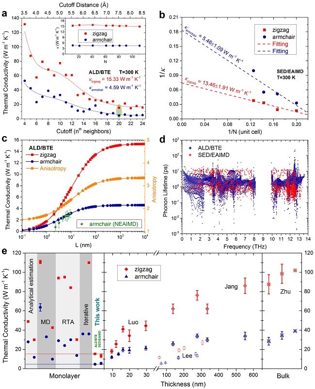 (c)室温下尺寸依赖的热导率和各向异性,与第一性原理非平衡分子动力学直接模拟计算得到的armchair方向的热导率符合很好;