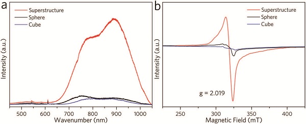 (b)Cu2O超结构、Cu2O微球、Cu2O立方体在相同实验条件下的电子自旋共振(ESR)谱