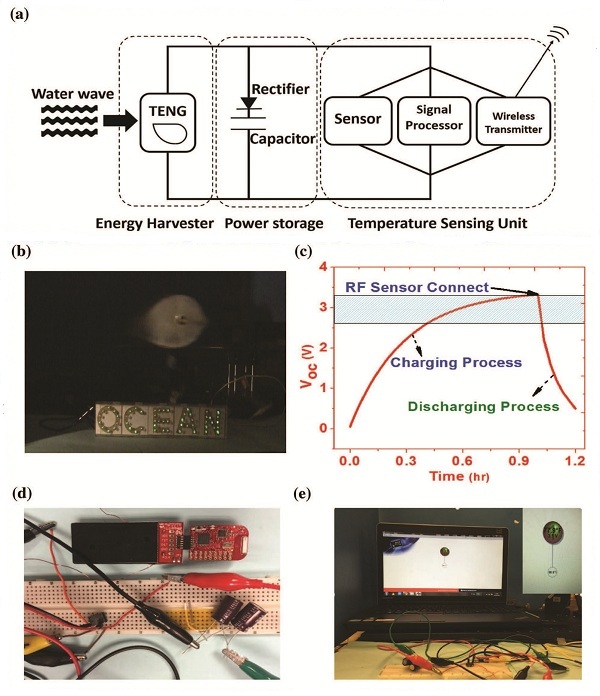 (a)利用摩擦纳米发电机为无线温度传感器供电的电路图