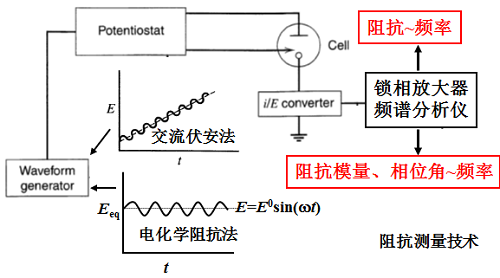 及给电化学系统施加一个频率不同的小振幅的交流正弦电势波,测量交流电势与电流信号的比值(系统的阻抗)随正弦波频率ω的变化,或者是阻抗的相位角f随ω的变化。