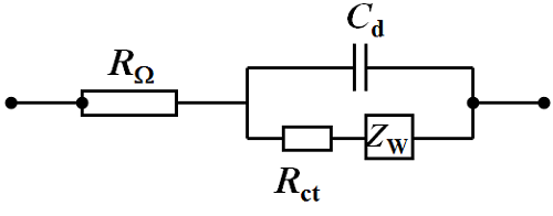 如果电荷传递动力学不是很快,电荷传递过程和扩散过程共同控制总的电极过程,电化学极化和浓差极化同时存在,则电化学系统的等效电路可简单表示为: