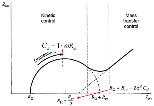 因此,平面电极上,电极过程由电荷传递和扩散过程共同控制时,在整个频率域内,其Nyquist图是由高频区的一个半圆和低频区的一条45度的直线构成(见下图)。高频区为电极反应动力学(电荷传递过程)控制,低频区由电极反应的反应物或产物的扩散控制。从图中可以求得体系的欧姆电阻,电荷传递电阻、电极界面双电层电容以及参数s,s与扩散系数有关,利用它可以估算扩散系数D。由Rct利用这个关系式Rct=RT/nFi0可进一步计算电极反应的交换电流i0,
