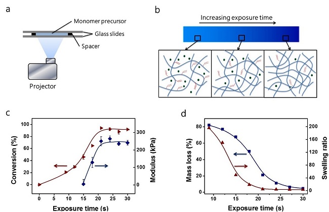 (c、d)不同的曝光时间对应的单体转化率、模量曲线和质量损失、溶胀率曲线。可以看出,曝光时间短的样品溶胀率高,曝光时间长的样品溶胀率低。