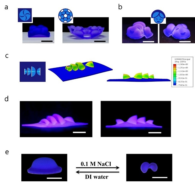 以水凝胶体系为例,将单体进行光聚合,曝光时间短的区域所得聚合物交联密度低,吸水后体积膨胀较大;曝光时间长的区域所得聚合物交联密度高,吸水后体积膨胀较小(图一所示)。二维平面材料区域化吸水倍率的差异将导致其膨胀为三维形状。通过平面不同区域曝光时间的控制,可以得到预先设定的不同三维形状,如图二所示的卡通人脸,悉尼歌剧院。与工程力学系宋吉舟课题组的合作,对模型进行力学有限元模拟为实验提供有力的指导(图二c所示)。