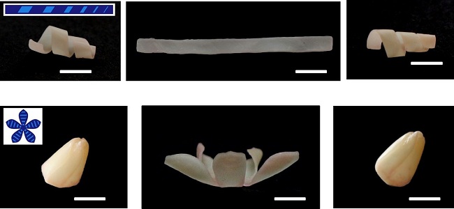 所有的插图都代表着打印的平面图案,深蓝色区域代表曝光时间长的区域(曝光时间4s),浅蓝色区域代表着曝光时间短的区域(曝光时间2s)。比例尺均为1cm。梯度螺旋结构和花朵结构的形状记忆行为。左边均为原始形状(不同区域在石蜡中的溶胀差异导致变形得到的三维的结构),中间为临时形状(通过加热到石蜡融化温度以上,手动变形,在冷却定性得到),右边为回复的形状(通过加热到石蜡融化温度以上,形状回复)。