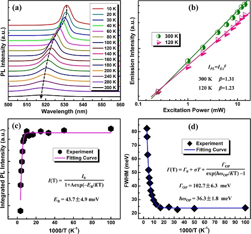 (b). 在300和120K下CsPbBr3量子点的积分PL强度和激发功率之间的关系