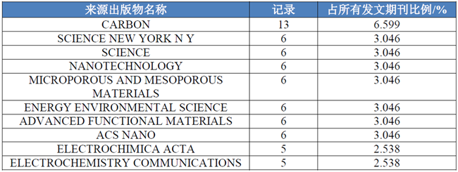Yury Gogotsi教授从2007年开始到2016年这十年间主要发布的期刊包括Carbon、Science、Nanotechnology等24种期刊,其中,Carbon数量高达13篇,ACS Nano、Science等数量也达到了6篇。总体来说,发文数量多且期刊影响因子高。下表是发表的10种主要期刊数量和所占比例的统计情况。