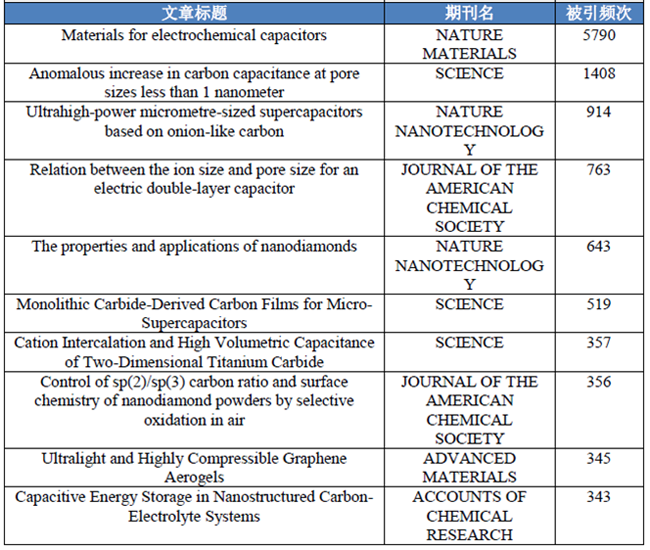 Yury Gogotsi教授从2007年开始到2016年这十年间发布的多篇文章具有很高的被引频次,其中发表在Nature Materials、Science上的两篇文章被引用超过1000次,前者的被引频次更是高达5790次。下表就10篇高引用频次文章的信息进行统计。