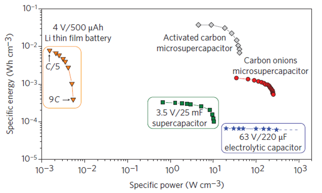 图1.将典型的电解电容器、超级电容器、电池和微型器件的比能量和功率密度进行对比。