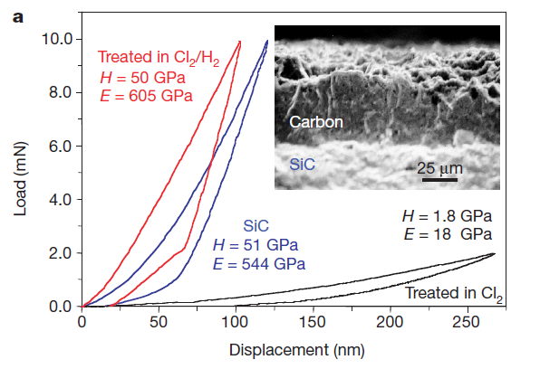 商业上合成人造金刚石一般需要高压、化学气相沉积和冲击波过程,但是由于生产量底,成本高,这些方法都有局限性。作者提出一种可供选择的金刚石生长方法,包括等离子体活化、高压、特殊的前驱体或者爆炸的混合物,但是实际生产率较低、而且限于小体积和薄膜材料。作者在氯气氛围下,环境压力和不超过1000℃的条件下,从碳化硅中提取合成了一种立方体或六角形纳米晶、微晶的金刚石结构碳。混合气体中存在的氢可以保证碳化硅到金刚石结构晶体碳稳定的转换且晶体尺寸在5-10纳米范围内。通过这个方法制备的金刚石结构碳纳米晶涂料显示出理想的机械性能,硬度值超过50Gpa,杨氏模量达到800Gpa,且这种方法适用于金刚石结构晶体碳的大规模生产。